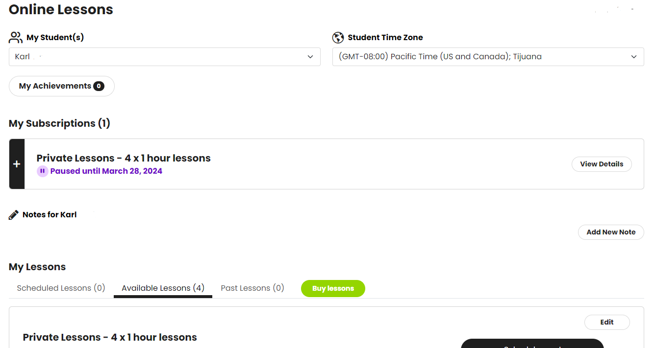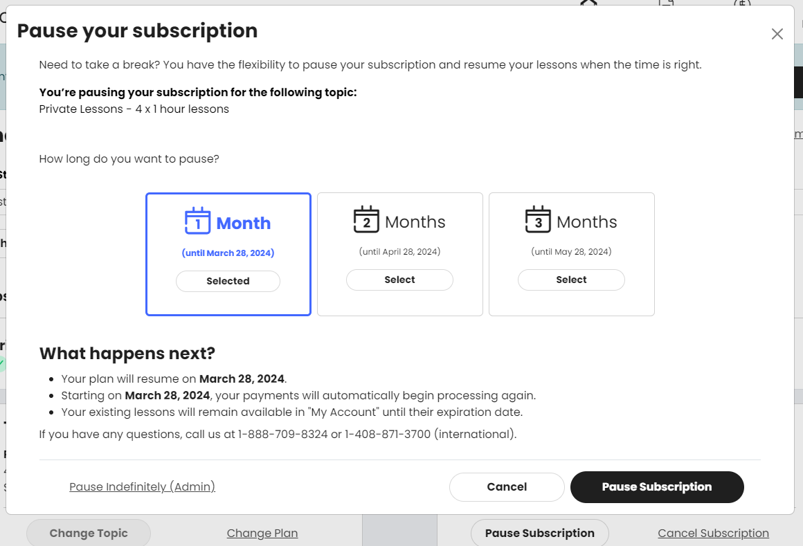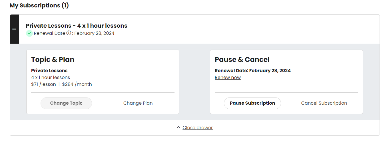 Your subscription is set to renew once a month based on your purchase date. Lessons will be automatically added to your account and ready to schedule. Please note that if you purchased a subscription on the 29th, 30th, or 31st of the month, it will ...
