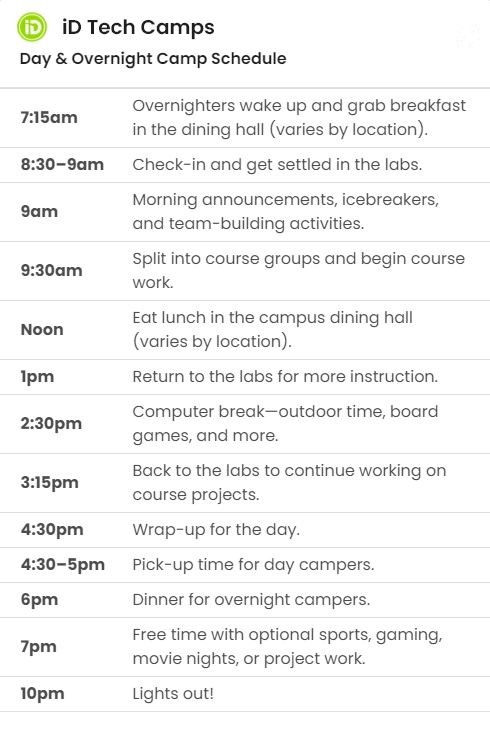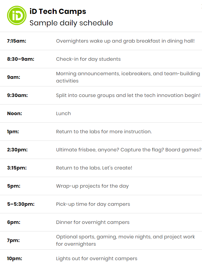 Day camp sessions at iD Tech Camps are from 9am-4:30pm. You can check in your student anytime between 8:30-9am, and pick them up between 4:30pm-5pm, Monday through Thursday. Pick-up on Friday will be from 2-3pm. Overnight students will check in the ...